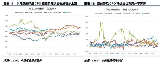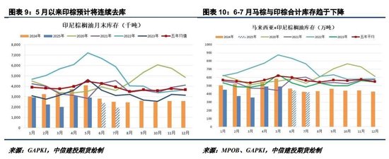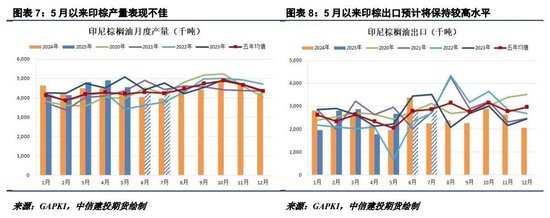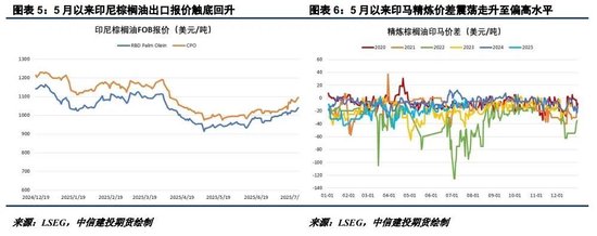 然而,我们近期也关注到一个事实,产量占比更高的印尼棕榈油供应在收紧,这令产地总供应压力比单马来西亚小很多,这从5月以来印尼较强的出口报价及走升的印马价差可看出一定端倪。GAPKI最新数据显示,印尼5月棕榈及仁油产量456万吨,环比降7%,表现差于预期;与此同时,出口大增令其月末库存降至292万吨,环比降4%。而继5月减产去库后,印棕6月以来的供应形势也不乐观,产地反馈印棕6月环比减产9%左右,7月产量未见明显恢复,而这期间印棕出口在进一步降税的背景下预期较好,印棕6-7月有较大概率延续去库。