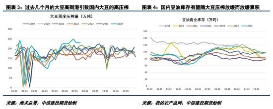 然而,随着巴西及美国生柴政策逐步实施,我们预计国际豆棕价差仍有进一步上行空间,棕榈油仍将是未来有较高性价比的油脂。而在中国迟迟未能重启美豆采购的背景下,9-10月的国内大豆到港量有望从此前的1100万吨高位下滑至950万吨、850万吨,且在明年3月巴西新作大豆到港前有不小的概率维持低位,国内大豆压榨下滑及豆油累库放缓或导致国内出口能力受到显著约束,限制国内豆油出口印度对产地棕榈油出口的冲击。