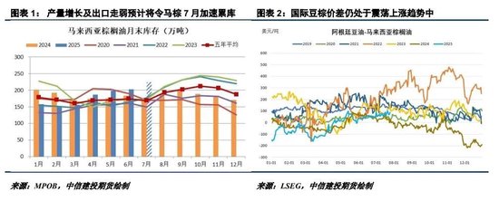 本周马棕偏利空的阶段性产量及出口数据为棕榈油走势带来压力。SPPOMA及UOB分别预计马棕7月1-20日产量较上月同期增6.19%和5%-9%,但统计范围更广也相对更准确的MPOA却给出明显更高的11.24%增幅预估,这对棕榈油市场做多热情带来明显打压。此外,船运机构ITS及AmSpec分别预计马棕7月1-25日出口较上月同期降9.2%及15.22%,出口降幅的扩大也进一步增添了市场对马棕7月加速累库的忧虑。