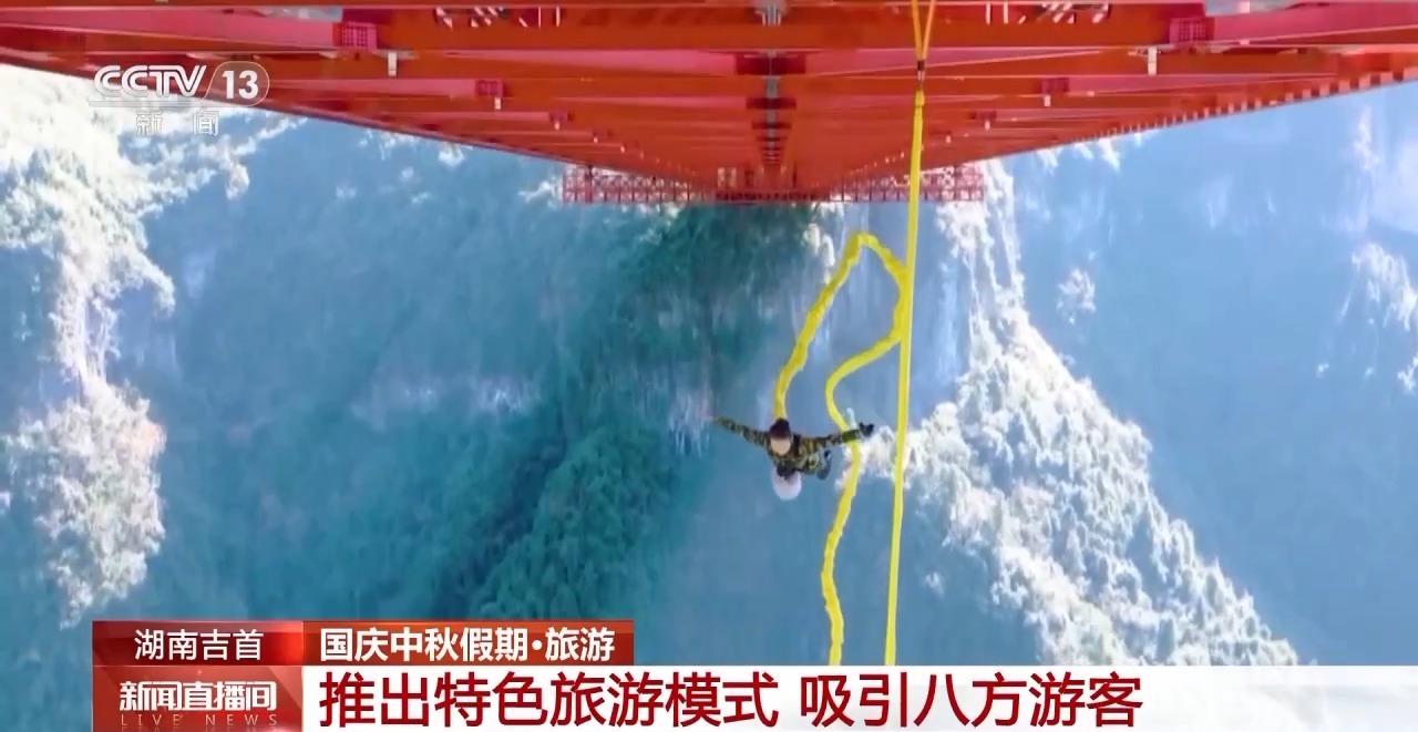 在湖南湘西吉首市,矮寨奇观旅游区热闹非凡。当地推出“非遗+实景+互动”特色旅游模式,吸引不少游客。在这里,游客既能在矮寨大桥挑战高空项目,又能走进苗寨,沉浸式感受少数民族风情。