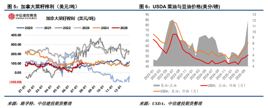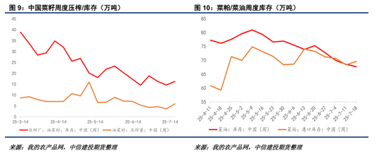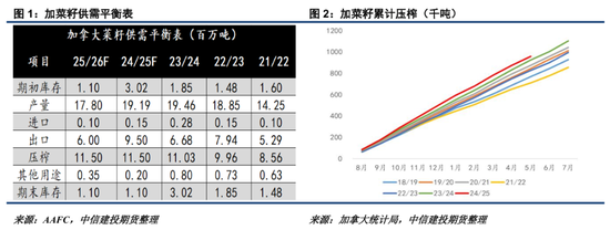 AAFC在7月供需平衡表调整中最终上调了25/25年度旧作预估产量至1919万吨,同时上调出口目标,最终导致结转库存为110万吨,基本维持不变。但在25/26年度展望方面,其小幅下调产量预估至1780万吨,并将出口目标和压榨目标分别设置在600万吨和1150万吨,总供应与总需求基本匹配,导致结转库存与24/25年度一致,在110万吨水平。由于美国生物柴油政策尚未完全落地,且中加菜油贸易存在客观限制,后期加菜籽供需平衡表的主要分歧或集中在压榨目标。