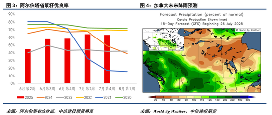 由于本年度加菜籽种植面积下降,以及25年上半年相对匮乏的降水,市场对25/26年度新季加菜籽产量持减产预期。不过,在7月期间加菜籽产区整体降水改善,且预计8月期间雨热将维持正常水平,因此加菜籽产量进一步下调的概率不高,预估最终定产将在1800万吨左右。